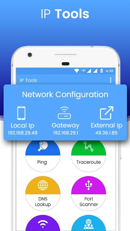 IP Information, Ping tools, Net Scan, Network Discovery, Network Refresher, Whois, Netcut, Network Info, Port scanner, TCP ports scanner, Wi-Fi scanner, DNS Lookup, Wake on LAN, Network Refresher, IP Calculator and many more.