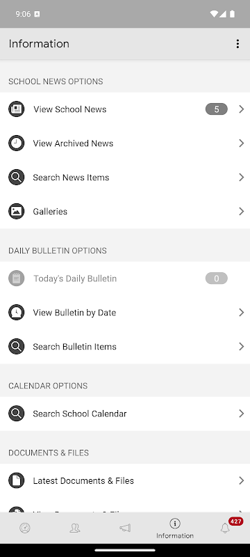 Seperti aplikasi iStudent, terdapat akses penuh kepada semua berita dan buletin sekolah (kedua-dua berita semasa dan arkib), kalendar sekolah dan direktori sekolah.