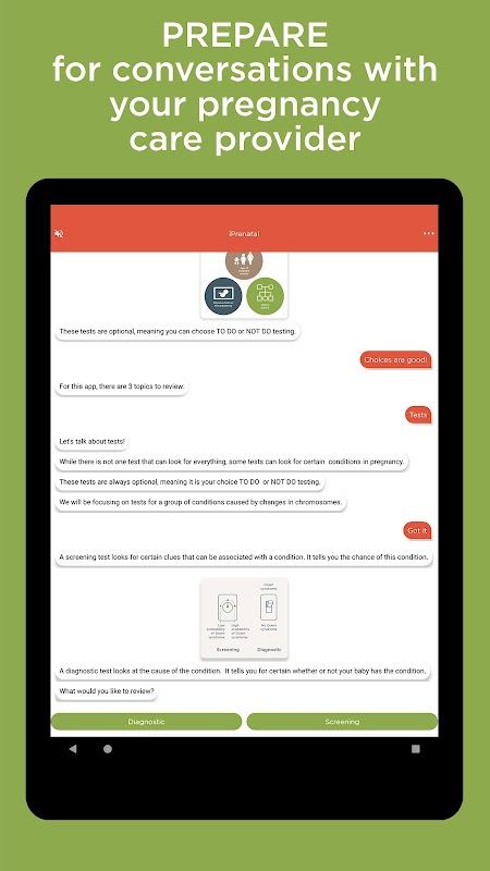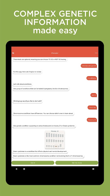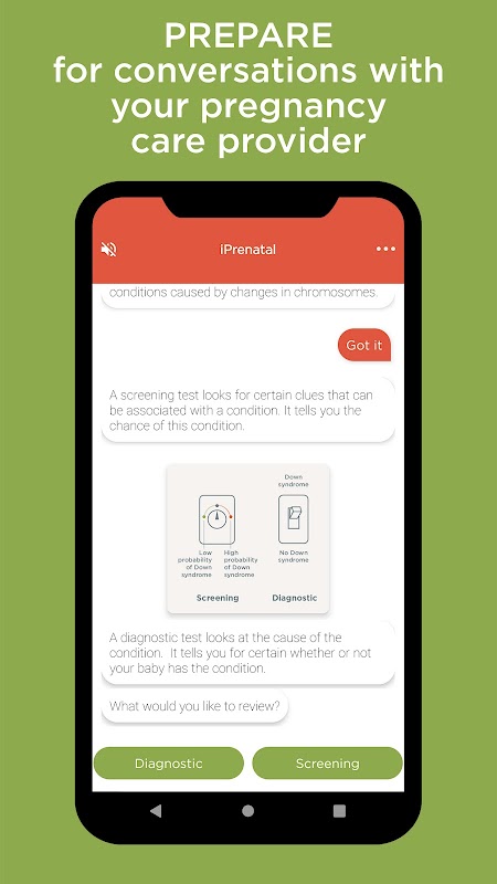 iPrenatal menerangkan kromosom, keadaan yang boleh dikenal pasti oleh saringan pranatal, dan pilihan ujian yang tersedia termasuk NIPT (ujian pranatal tanpa invasif) dan dibangunkan oleh pasukan doktor dan pakar genetik dari Roche.