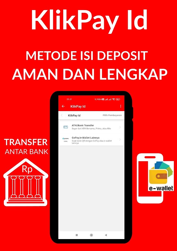 Aplikasi android KlikPay Id Adalah aplikasi mobile untuk member-member setia KlikPay Id di mana pun berada. Aplikasi ini memudahkan Anda dalam melakukan berbagai transaksi seperti pengisian pulsa, pembelian token listrik, pembayaran tagihan pasca bayar, pembelian voucher, Belanja kebutuhan harian, kesehatan, Style dan masih banyak lagi.