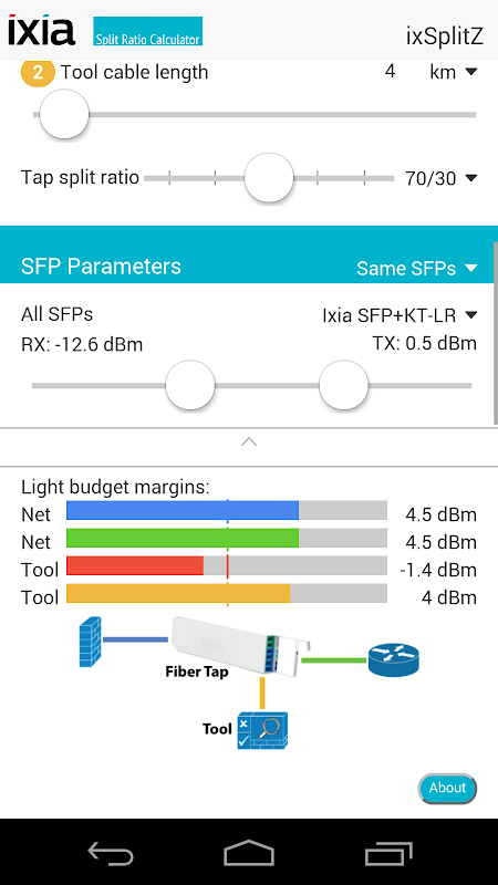 Menggunakan bahagian Parameter SFP untuk menentukan kuasa pelancaran dan menerima sensitiviti penerima yang anda gunakan. Jika anda memilih "SFPs Sama," SFP Ixia untuk kelajuan yang dipilih dan jenis kabel secara automatik digunakan untuk semua empat titik hujung. Jika anda memilih "SFPs berbeza," anda boleh memilih dengan nombor bahagian SFP daripada senarai tarik turun di sebelah kanan, atau anda boleh mencari maklumat dalam kepingan data penerima anda memasukkannya menggunakan slider. Senarai tarik menawarkan hanya penerima yang dipadankan dengan kelajuan pautan dan jenis kabel yang ditetapkan dalam bahagian atas.