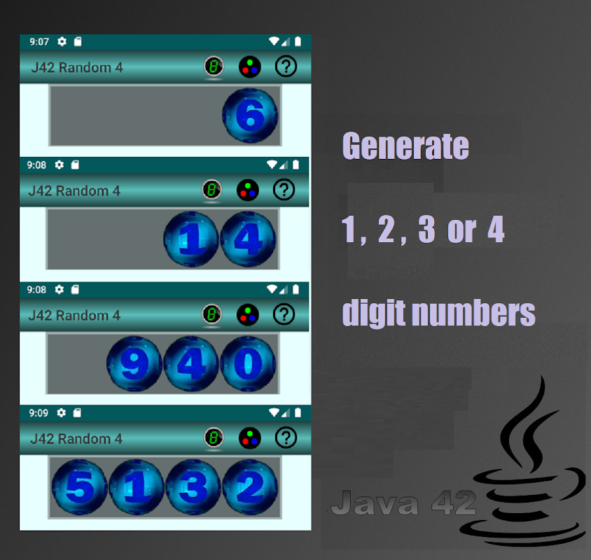 Aplikasi ini akan menghasilkan urutan nombor 2, 3 atau 4 digit yang tidak dapat diramalkan secara munasabah. Ketik digit untuk mematikan atau menghidupkannya. Sebarang ramalan yang dapat diperhatikan tidak lebih dari sekadar kebetulan atau kebetulan. Tiada digit individu yang boleh diramalkan dari pengetahuan mengenai digit atau kumpulan digit yang lain.