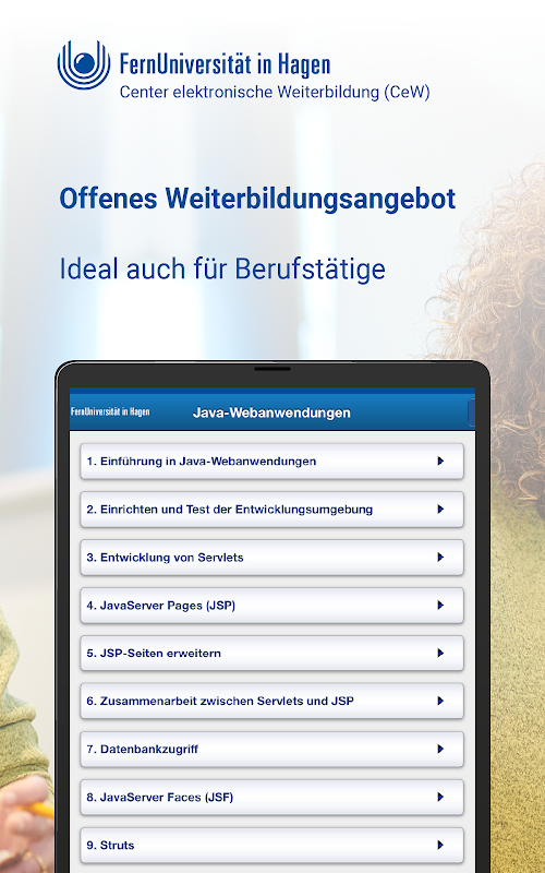 Aplikasi ini menyokong kursus sijil FernUni. Bab pertama tersedia secara percuma untuk pratonton. Untuk mengakses kandungan penuh, tempahan melalui CeW (CeW) FernUniversität di Hagen diperlukan.