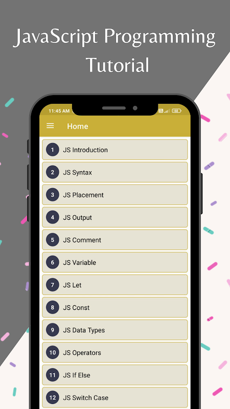 Belajar JavaScript dengan berkesan dengan apl yang komprehensif dan bebas iklan ini! Sama ada anda seorang pemula yang memulakan langkah pertama anda ke dalam dunia pembangunan web atau pengekod berpengalaman yang ingin menyempurnakan kemahiran JavaScript anda, apl ini telah membantu anda.