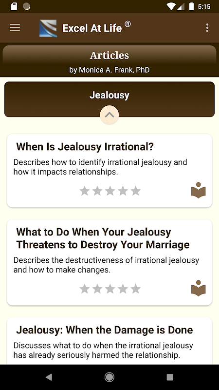Alat Cemburuan CBT oleh Excel At Life mengajar anda bagaimana menggunakan kaedah terapi kognitif-tingkah laku (CBT) dalam format mudah untuk belajar bagaimana mengurus kecemburuan yang tidak rasional. Alat yang disediakan dalam aplikasi ini berasal dari pangkalan penyelidikan CBT dan dikembangkan menjadi format yang mesra pengguna oleh ahli psikologi dengan pengalaman klinikal lebih dari 30 tahun.