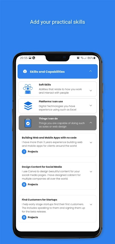 Platform ini direka bentuk dengan cara yang membolehkan pengguna memutuskan sejauh mana mereka ingin berkongsi tentang diri mereka sendiri, daripada pengalaman kerja yang mudah, kepada spesifikasi projek yang mereka telah terlibat, kemahiran yang mereka ada dan platform yang boleh mereka gunakan
