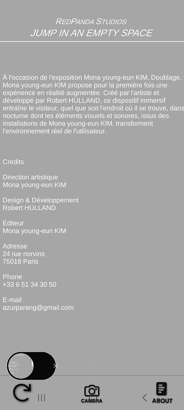 Jump In An Empty Space ialah aplikasi realiti tambahan daripada artis Mona Young-eun Kim. Dibuat oleh Robert Hulland ia telah dibangunkan bersama dengan kolektif Artlete. Ia menunjukkan imbasan 3D penari hip-hop untuk ditemui penonton.