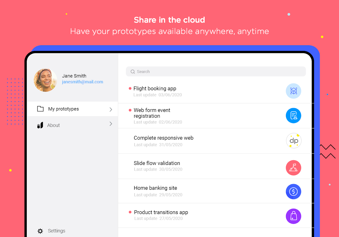 Semua projek yang dibuat dengan Justinmind boleh dikongsi di awan. Setelah prototaip anda berada di awan, ia boleh diakses melalui pemapar Justinmind. Ini bermakna anda bebas untuk menguji dan mengalami kerja anda menggunakan peranti mudah alih anda!