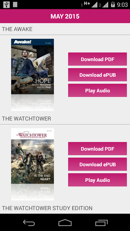 Bible-based magazines published by Jehovah's Witnesses are available to download as MP3, PDF and EPUB files in over multiple languages.