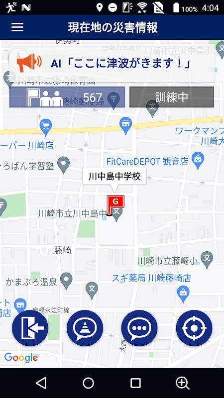本アプリでは、避難訓練における、行政からの情報や、AIによる浸水可能性を判定した情報、アプリ利用者からの共有情報などを表示します。