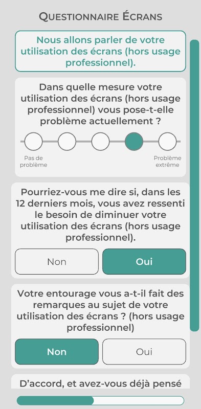 Bergantung pada jawapan anda, penyelesaian diperibadikan untuk mengawal penggunaan anda dan meningkatkan kualiti tidur anda akan ditawarkan kepada anda: nasihat diperibadikan untuk diletakkan dan alat pemantauan (diari tidur dan diari penggunaan).