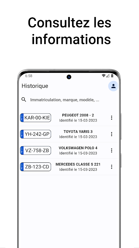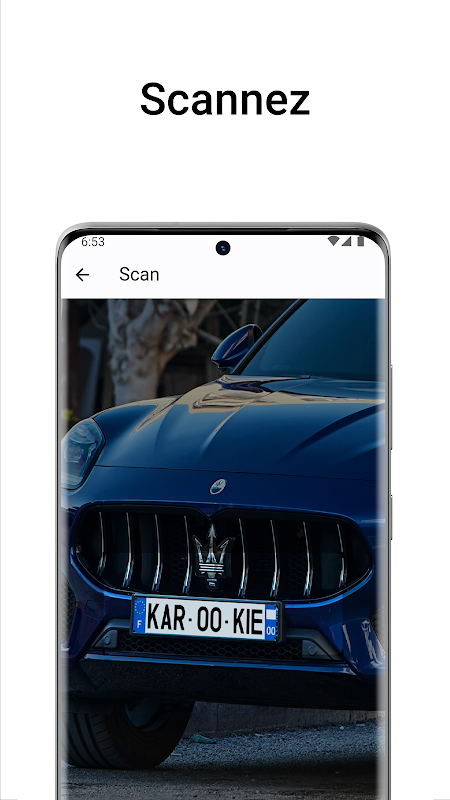 Karookie memberikan maklumat terperinci tentang kenderaan yang didaftarkan di Perancis. Anda boleh menggunakan pilihan kemasukan manual untuk memasukkan nombor plat, atau gunakan kamera peranti anda untuk mengimbas plat. Sebaik sahaja anda memasukkan atau mengimbas nombor plat, Karookie mendapatkan semula semua maklumat yang tersedia tentang kenderaan, termasuk jenama, model, jenis bahan api, kuasa kuda cukai, nombor siri dan butiran penting lain.