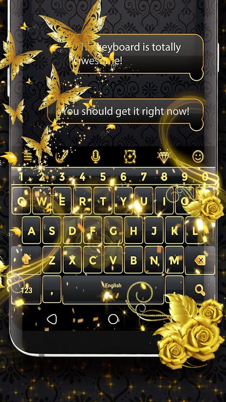 Tema telefon bergaya hitam mewah ini juga merupakan tema skrin kunci elegan dan tema pelancar melalui kertas dinding hidup hitam elegan yang disertakan dengan rama-rama emas. Mula-mula anda perlu memuat turun dan memasang Keyboard 2023 Versi Baru utama dan selepas itu tema Black Elegant Keyboard dapat diaplikasikan! Dengan Papan Kekunci 2023 Versi Baru anda juga mendapat akses ke ciri-ciri keren seperti Gambar Latar Hidup 2023 yang hebat!