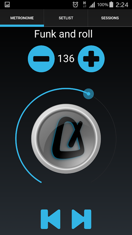 - The METRONOME page may be enough for basic users. It has controls for switching the click on or off and changing the tempo. If you have created a playlist, switching between songs can be also done from the METRONOME page. The name of the current song can be edited by clicking on it.
