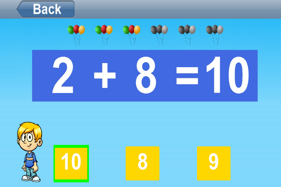 Dalam skrin seterusnya kanak-kanak yang memilih untuk bermain penambahan atau penolakan dan jika ia terpulang kepada 10 atau sehingga 20.