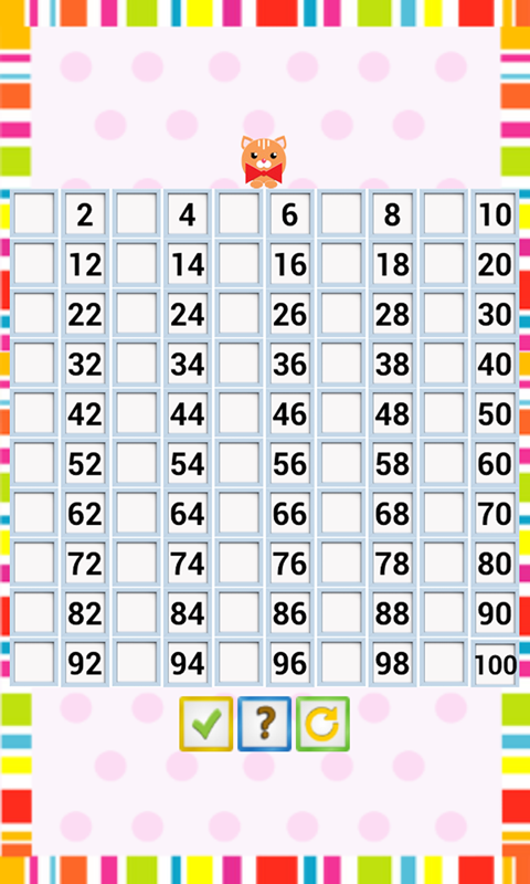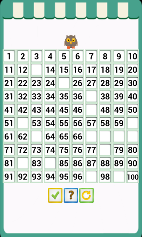 5) Nombor Hilang. Kanak-kanak boleh menetapkan bilangan nombor yang hilang dalam carta ratus. Terdapat tiga peringkat - Mudah, Sederhana, Susah
