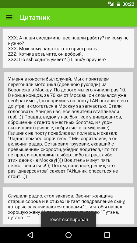 Приложение Kill The Time позволяет загружать и читать развлекательный контент из сети Интернет. Используются пять популярных источников: Цитатник, Истории, Анекдоты, Афоризмы, Говорят Дети. Простое и красивое приложение без рекламы и с материальным дизайном поддерживает копирование целого сообщения по одному клику, чтобы вы могли делиться понравившимися вам цитатами с друзьями через различные мессенджеры и социальные сети. Обновление доступно по движению свайп (движением пальца сверху вниз по экрану телефона), а чтение возможно и в местах, где нет сети или плохой интернет. Поэтому наше приложение скрасит ваше время и поднимет вам настроение в метро или другом общественном транспорте, в очередях или просто, когда у вас будет свободная минутка.
