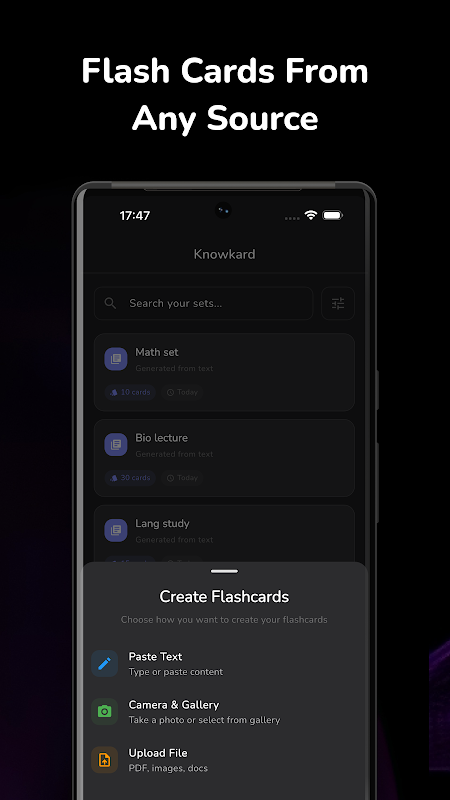 Ucapkan selamat tinggal kepada jam pembuatan kad imbas manual. Dengan Knowkard, anda boleh menukar mana-mana teks, nota, PDF atau kandungan web menjadi kad imbas sedia belajar — dalam beberapa saat. Sama ada anda sedang bersiap untuk peperiksaan, mempelajari bahasa baharu atau menguasai topik baharu, Knowkard membantu anda belajar dengan lebih bijak, bukan lebih sukar.