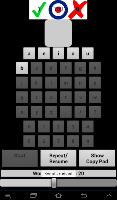 As a self-test you can choose the Copy Pad, on which you can write the character presented to you. This does NOT attempt to recognize your handwriting, but rather serves as a self attest to your accuracy.