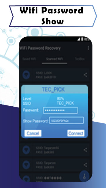 Kunci Papar Kata Laluan Wifi membolehkan mendapatkan semula kata laluan wifi yang disimpan peranti yang pernah anda sambungkan di mana-mana. Ini bukan aplikasi penggodam kata laluan wifi. Pemulihan kunci Wifi untuk WAP ,WPA, WPA2 psk wep dan rangkaian lain.Tunjukkan Kata Laluan WIFI-Semua wayarles Induk Kata Laluan ialah induk kunci Wi-Fi untuk mencari kunci Wi-Fi atau kata laluan rangkaian yang disambungkan pada peranti anda pada bila-bila masa
