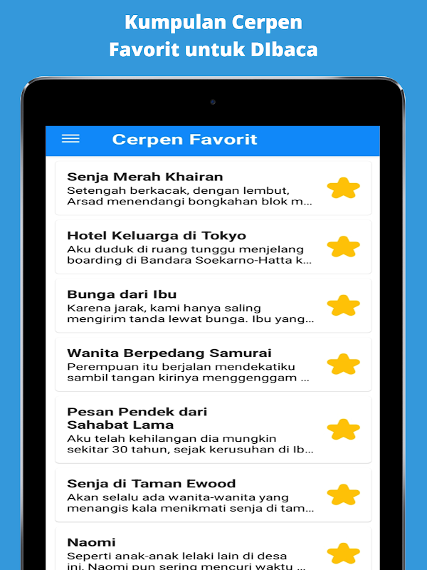 Cari cerita pendek favorit kamu dan simpan ke dalam daftar favorit untuk membuat koleksi cerita pendek favoritmu. Aplikasi ini memudahkan kamu menemukan cerpen yang pas untukmu.