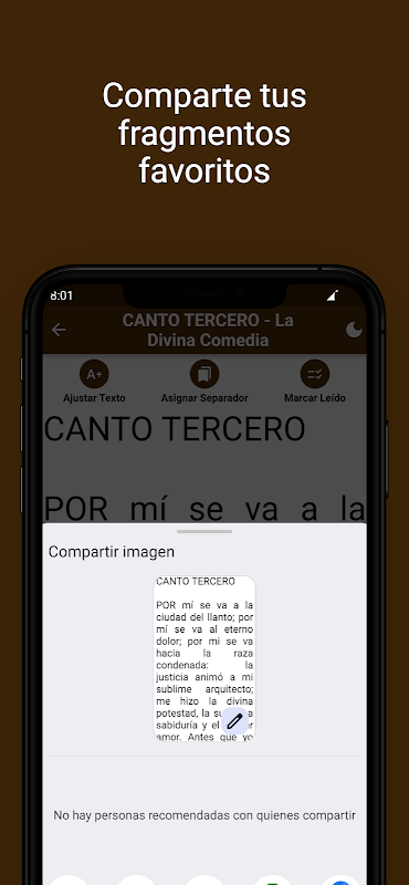 * Agregada funcionalidad de compartir cualquier fragmento del libro en tus apps favoritas.