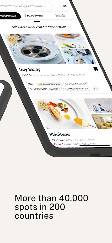 Sebanyak 40,000 alamat restoran, kedai pastri dan kini hotel boleh didapati dengan hanya beberapa klik. Terima kasih kepada metodologi pemilihan dan kedudukan berdasarkan purata wajaran lebih daripada 1000 sumber, termasuk panduan, penarafan, artikel akhbar dan ulasan pengguna, temui 1000 Restoran Terbaik dan Hotel Terbaik di dunia La List.