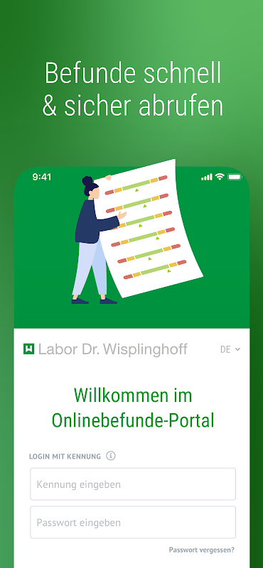 Dengan aplikasi ini, makmal Dr. Wisplinghoff menawarkan penghantar yang penemuan makmal kemungkinan bila-bila masa, di mana-mana data secara langsung selepas pengesahan. Sama ada anda berada di pejabat atau dalam lawatan rumah - anda akan mempunyai akses penuh kepada penemuan berkaitan pesakit anda.