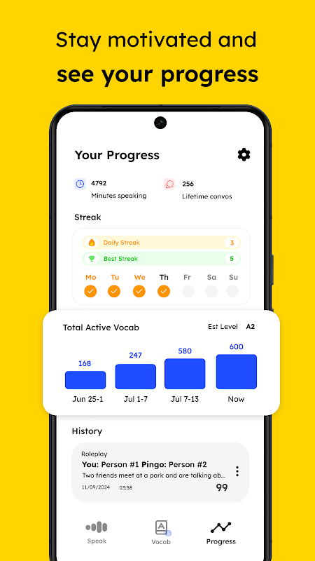 Bercakap tentang hari anda, tanya soalan dan teroka bahasa bersama-sama. Pingo, rakan bercakap anda, memberi anda maklum balas segera untuk meningkatkan kemahiran pembelajaran bahasa anda secara mendadak. Berlatih bercakap daripada 25+ bahasa untuk memperhalusi perbendaharaan kata, tatabahasa dan kefasihan anda, serta bercakap dengan yakin dalam pertukaran perbualan sebenar.