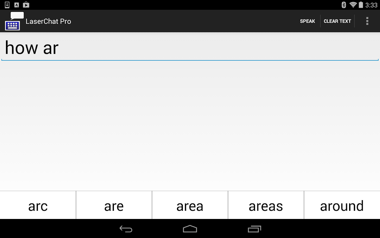 LaserChat is a text-to-speech application designed to be used with a Bluetooth keyboard, specifically the Safe Laser System developed by Invotek. Unlike most applications, the interface is easily accessible via a Bluetooth keyboard. The pro version provides word prediction, the ability to save documents, and the ability to speak single words, sentences, and paragraphs. Other features include hotkeys and custom word addition. For more information about our products, visit our website or contact us.