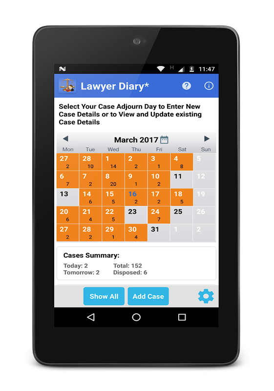 Aplikasi Diari Peguam* menggantikan diari manual untuk mengurus butiran Kes dan tarikh Penangguhan untuk setiap profesional Peguam. Menggunakan aplikasi ini, anda hanya boleh Tambah/Edit Butiran Kes, Pelanggan, Butiran Hubungan Peguambela Pihak Adverse dan kemudian Tambah Langkah dan Tarikh Penangguhan dll. Anda boleh melihat semua sejarah Kes sehingga tarikh tutup. Apl berfungsi sepenuhnya di luar talian, jadi tidak perlu sebarang rangkaian untuk mengurus data.
