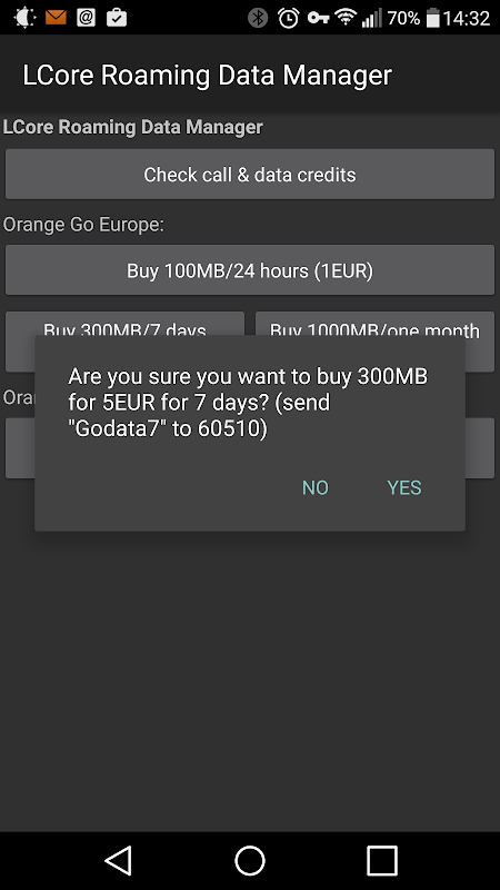 NOTE: Neither LCore Productions nor this application is affiliated with or endorsed by Orange S.A.. The application is solely meant for your convenience and requests the necessary features by sending text messages (SMS). No warranty is given for the correctness of the Orange Travel Data Package prices or the cost of the SMS transmission required to trigger the features. Also note that if the SMS is sent successfully but you receive no response the Orange service might be down.