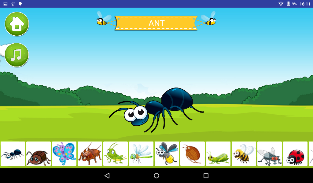 Belajar Mengenai Serangga terdiri daripada kuiz, di mana anak-anak perlu sepadan dengan nama serangga dengan imej yang sepadan. Kuiz ini akan membantu anak-anak untuk menguji pembelajaran mereka.