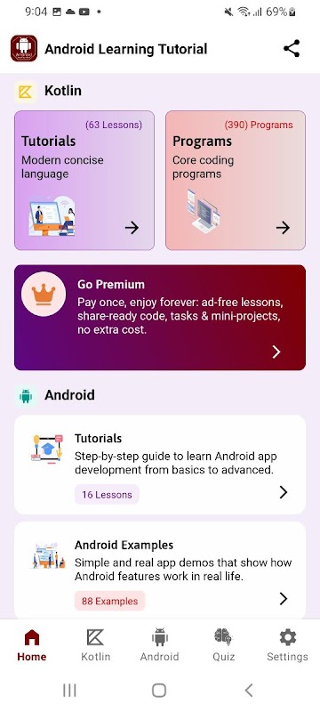 Sama ada anda ingin mempelajari Android, mempelajari Kotlin, mengamalkan contoh Android, bersedia untuk temu duga Android atau meneroka program Kotlin, apl ini menyediakan segala-galanya di satu tempat.