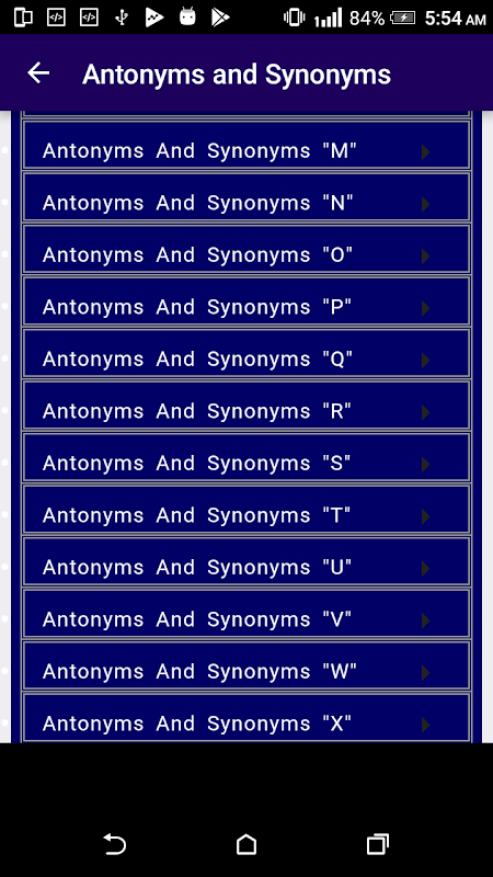 Aplikasi ini mengandungi Sinonim dan Antonim lebih daripada 10k perkataan dan dengan fungsi carian. Ia di luar talian sepenuhnya dan percuma. Sinonim dan Antonim sangat membantu pelajar dan aplikasi ini mengandungi senarai lengkap perkataan seperti kamus. Seperti kamus bahasa Inggeris, ia mempunyai banyak perkataan.
