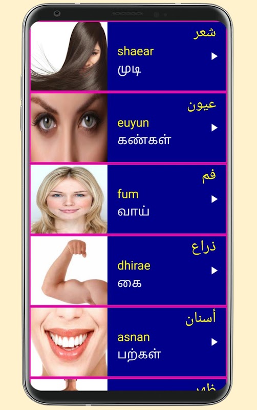 2. Setiap perkataan Arab mempunyai imej yang jelas 📸🖼️ dan sebutan audio 🎵🔊 untuk menjadikan Pembelajaran Bahasa Arab melalui Tamil Mudah.