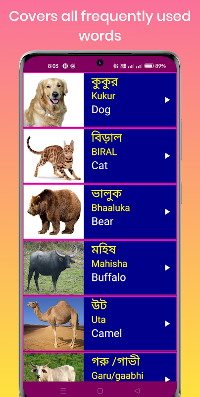 3. Semua perkataan dan ayat Bengali disediakan dengan makna bahasa Inggeris.