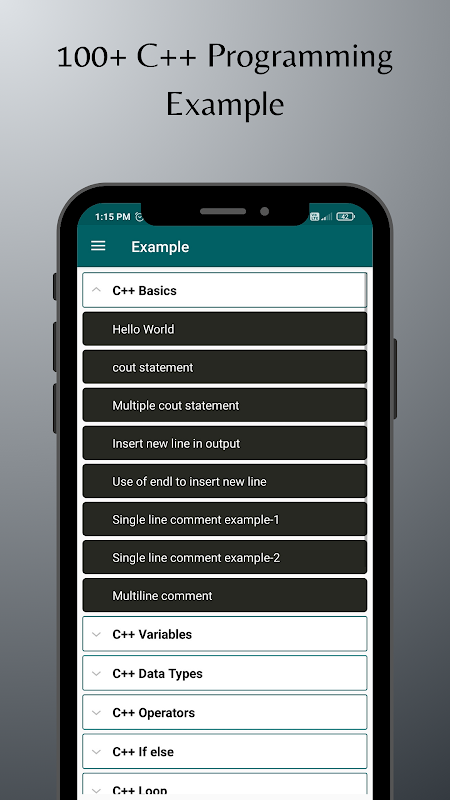 Apl ini merangkumi segala-galanya daripada asas sintaks C++ dan struktur program kepada konsep yang lebih maju seperti pengaturcaraan berorientasikan objek, warisan dan polimorfisme. Kami telah membahagikan topik yang kompleks kepada pelajaran yang boleh dihadam dengan penerangan yang jelas dan contoh dunia sebenar.