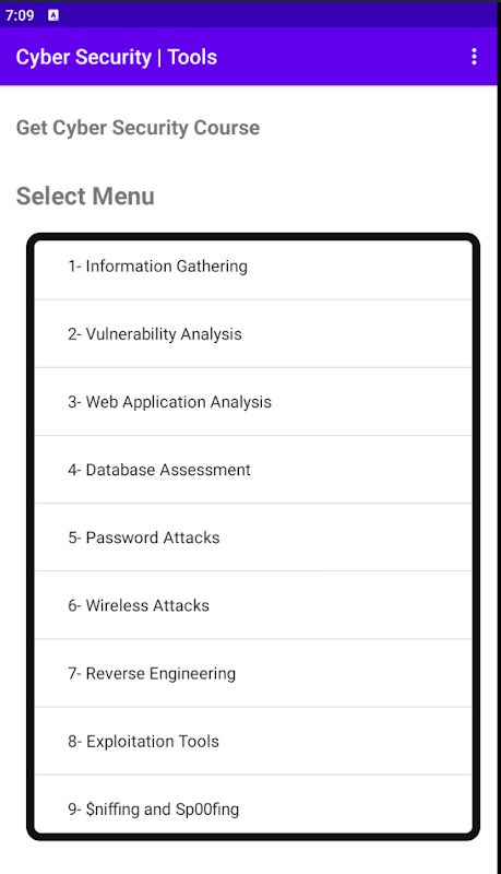 Apl Keselamatan Siber yang merangkumi semua menu dan submenu Kali Linux dan termasuk semua alat untuk pengumpulan maklumat, analisis kerentanan, analisis aplikasi web, penilaian pangkalan data, serangan kata laluan, serangan tanpa wayar, kejuruteraan terbalik, eksploitasi, $niffing dan sp00fing, post- eksploitasi, forensik, pelaporan dan kejuruteraan sosial.