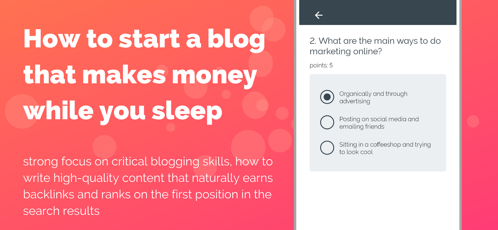 Anda memperoleh poin dengan lulus kuis setelah setiap bab! Ini adalah tingkat berikutnya dalam mempelajari pemasaran digital!