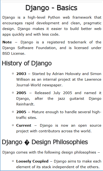 Django Tutorial for Beginners - Learn Django in simple and easy steps starting from basic to advanced concepts with examples including Basics, Overview, Environment, Creating a Project, Apps Life Cycle, Admin Interface, Creating Views, URL Mapping, Template System, Models, Page Redirection, Sending E-mails, Generic Views, Form Processing, File Uploading, Apache Setup, Cookies Handling, Sessions, Caching, Comments, RSS, AJAX.