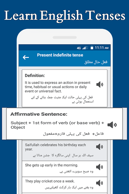 The app comes with all Tenses to learn and revise all the English Grammar Tenses. It have examples of all 4 types in each Tense. The examples are given Urdu Translation as well. Learn tenses to give better impression of yourself to the world.