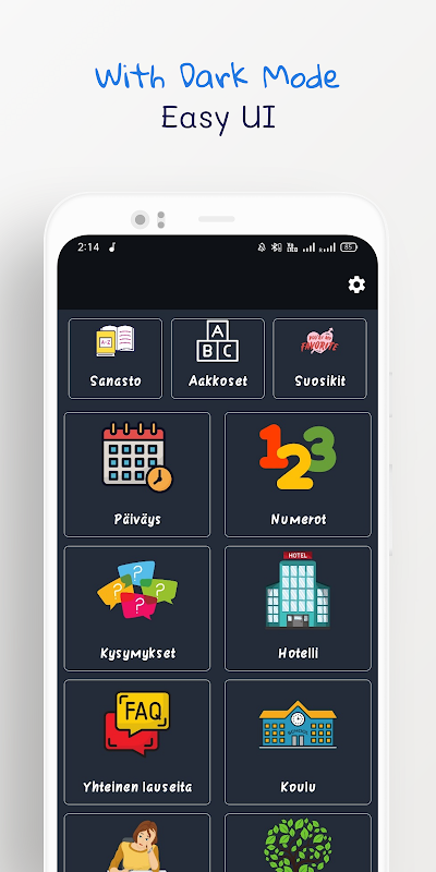 Aplikasi belajar bahasa Finland untuk pemula mempunyai 27 bahagian yang berbeza. Mereka ~ sekolah, kerja, haiwan, sukan, temu duga, soal siasat, ayat yang kerap, hotel, tarikh, masalah, restoran, kereta, warna, nombor, doktor, arahan, pengangkutan, badan, masa, perasaan, pasaran, perjalanan dan alam semula jadi, perkenalan, cuaca, astrologi, salam dan belanja. Kategori sudah cukup untuk kebanyakan ayat yang anda perlu pelajari dalam situasi dan tempat ini.