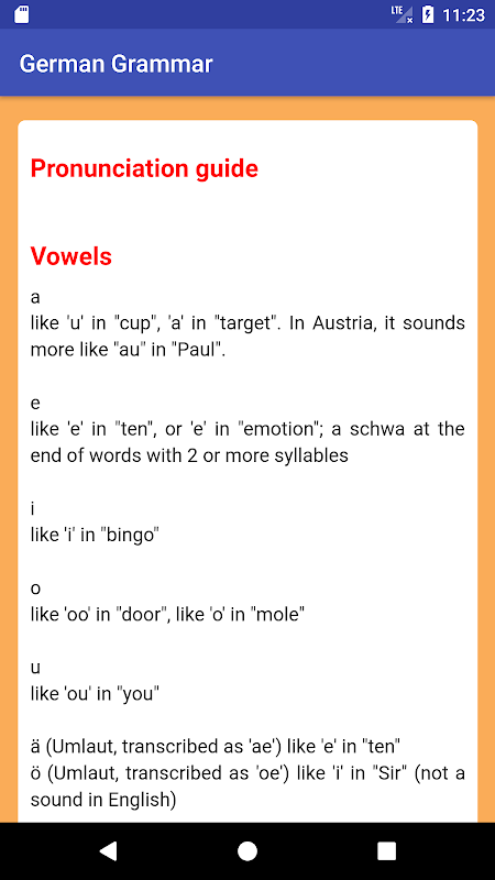 The Learning german application has beautiful graphics design and user friendly interface which is divided into three major parts (i.e. German Language Grammar Overview, Top 2000 most commonly used words (vocabulary) and Daily life conversation phrases utilized almost in daily life routine whether you are driving, vising bars, restaurants, choosing eating menu and facing problematic situations or defending yourself by showing your expressions with authorities.