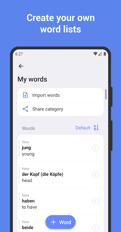 • Tambah perkataan dan kategori anda sendiri dengan mudah: anda boleh mencipta pangkalan perkataan anda sendiri yang ingin anda kuasai dahulu.