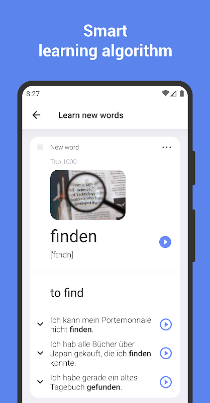 • Kad imbas Jerman berguna dengan gambar dan contoh ayat: pintasan mental yang berguna untuk membina perbendaharaan kata anda dan memahami nuansa makna perkataan dan cara perkataan ini digunakan dalam amalan sebenar.