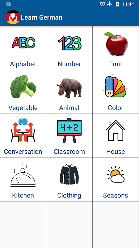 Kursus Asas Pembelajaran Jerman membantu untuk belajar abjad, nombor, buah-buahan, sayur-sayuran, haiwan, warna dan perbualan dalam bahasa Jerman.