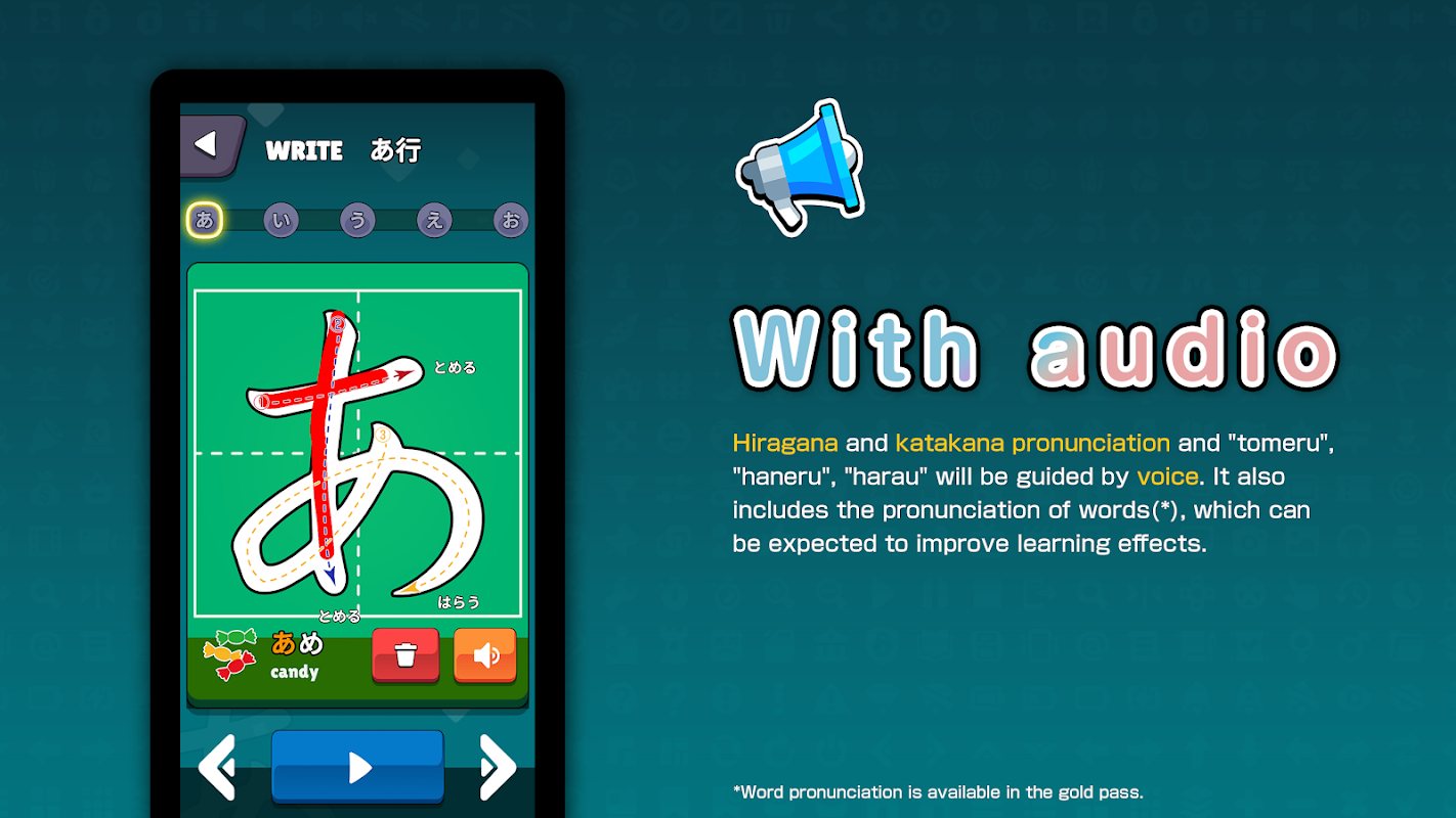 Selain sebutan hiragana dan katakana, kami menyediakan panduan audio tentang TOMERU, HANERU dan HARAU. Selain itu, sebutan perkataan disertakan, jadi anda boleh mengharapkan kesan pembelajaran yang lebih baik.