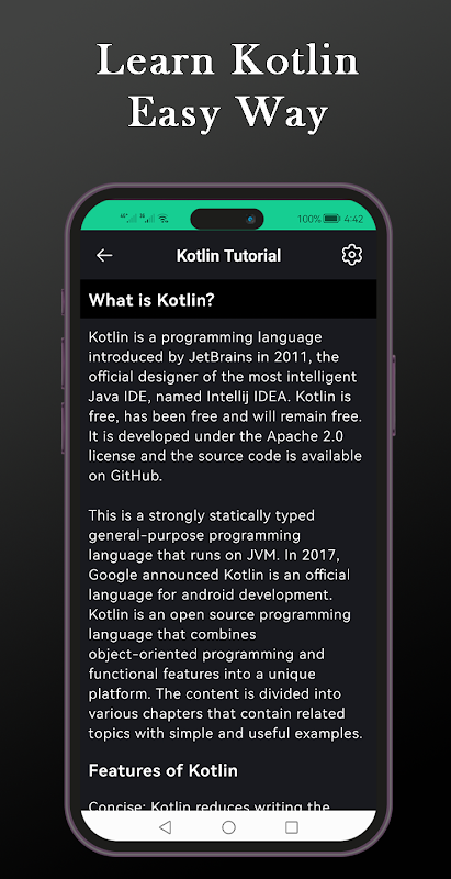 Laluan Pembelajaran Komprehensif: Apl kami menawarkan laluan pembelajaran tersusun dengan teliti yang membawa anda daripada asas Kotlin kepada konsep lanjutan. Mulakan dengan asas seperti pembolehubah, jenis data dan aliran kawalan, dan maju ke topik yang lebih kompleks seperti pengaturcaraan berorientasikan objek dan pengaturcaraan berfungsi dalam Kotlin.