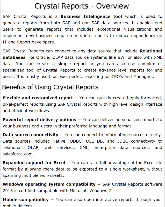 SAP Crystal Reports is a business intelligence tool helps in generating reports from SAP as well as non-SAP data sources. Knowledge of this tool is a plus for managers and business leaders who can generate quality advanced level reports which will help them in making better strategic decisions. This tutorial covers the key concepts of SAP Crystal Reports and how you can use it to generate professional reports.